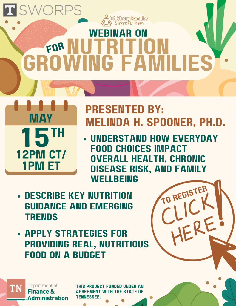 By visiting our website, you can view a list of our upcoming training by opening the Upcoming Webinars accordion. You can click on each flyer to get to the Zoom Registration. Once you fill out your information and submit, you will receive a link to join from Zoom. You can also email us at strongfamilies@utk.edu to receive the registration link.
